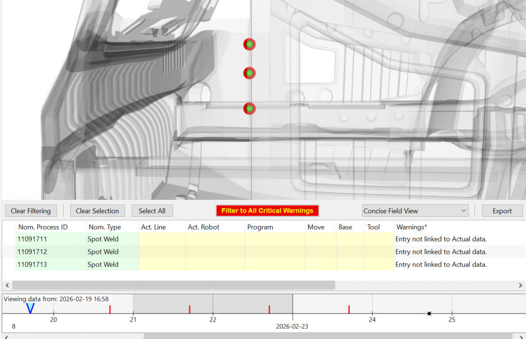 Inaccurate processes data corresponds to inaccurate results in tasks like welding and gluing, and can lead to recall-worthy issues like missed welds. RoboLive® visualizes trends, changes, and deviations in nominal instructions and actual results—helping you catch issues before they result in costly problems.