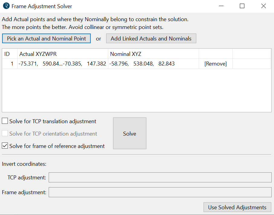 Selecting the Bestfit Override option from the Frames dropdown will open the module’s window, from which users can use a selection of nominal/actual points to manually adjust the frame positioning.